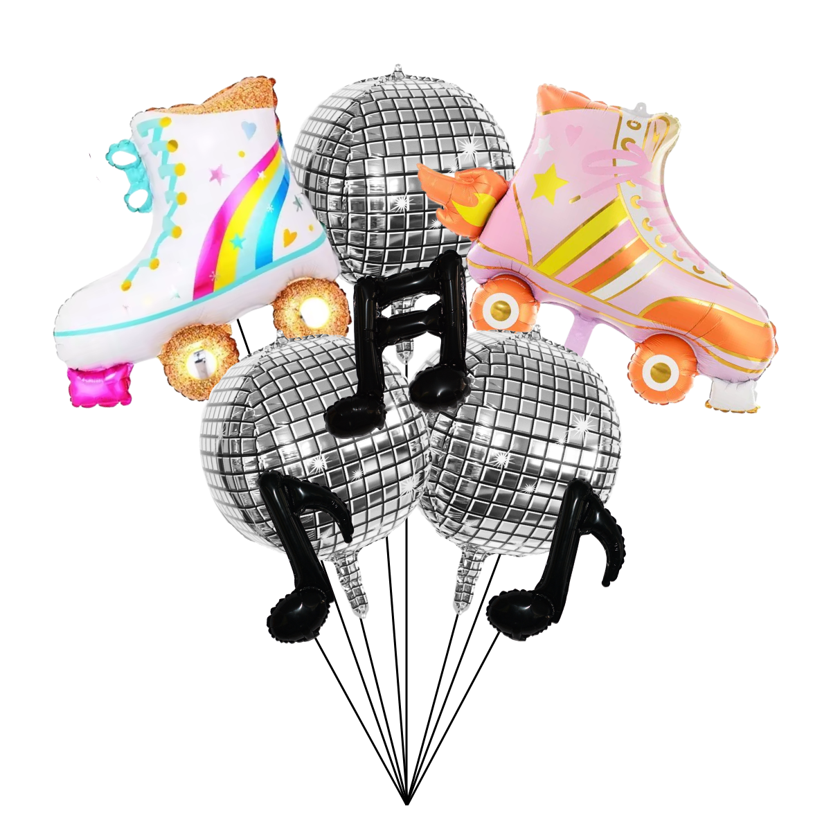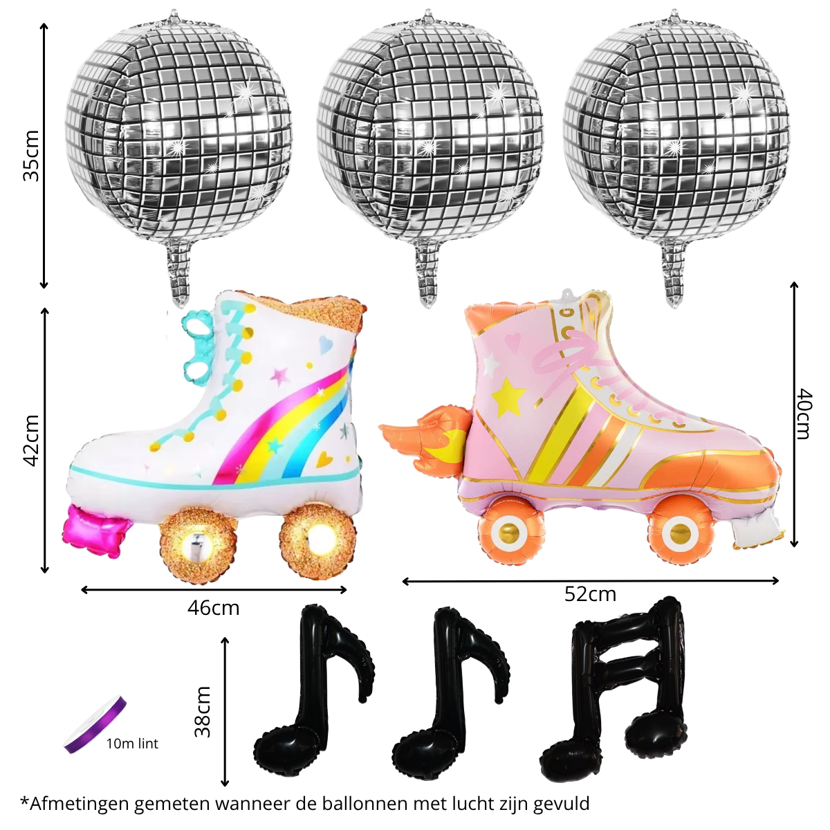 Inhoud:3x Discobal ballon2x Rollerskate ballon3x Muzieknoot ballon1x Lint paars (10meter)